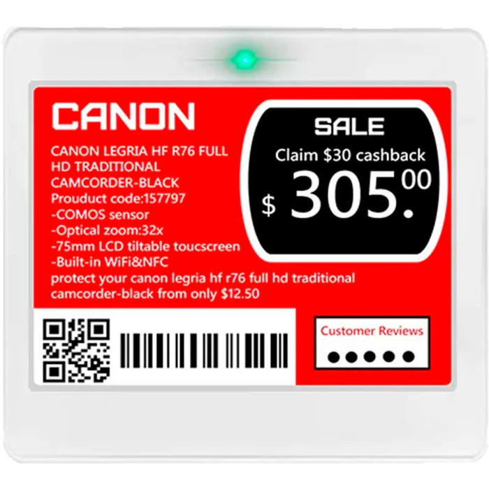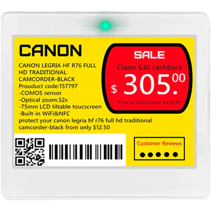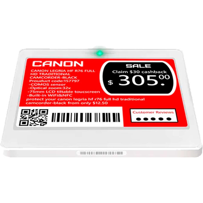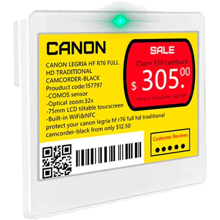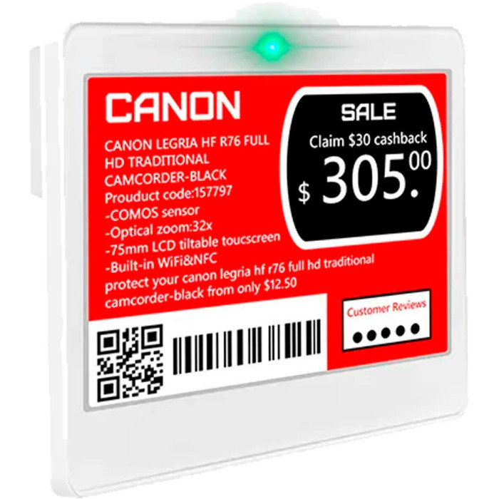 Цветной e-ink дисплей (черный, белый, красный, желтый) гарантирует высокую контрастность и отличную читаемость с любого угла обзора. Благодаря низкому энергопотреблению автономная работа электронного ценника достигает 5 лет при ежедневных обновлениях.