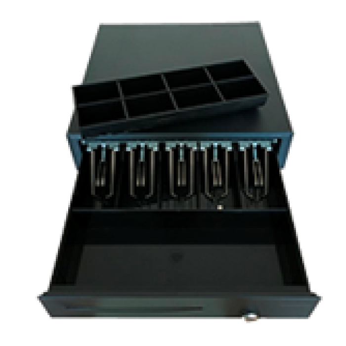 Денежный ящик ASAP POS L-410E — классический выдвижной денежный ящик предназначенный для хранения денежных средств (купюр, монет) и чеков. Денежный ящик имеет внутренний пластиковый вкладыш (съемный для монет), который имеет 8 регулируемых отделений для монет и 5 для банкнот, а также оснащен специальными металлическими держателями купюр. Спереди есть специальная прорезь для крупных купюр, чеков или расходных накладных. Замок на 3 позиции, с запасным ключем. Денежный ящик ASAP POS L-410E поставляется в классическом черном цвете. Имеет надежный механизм открытия/закрытия выдвижной части. Механизмы выдвижной части подлежат ремонту или полной замене.