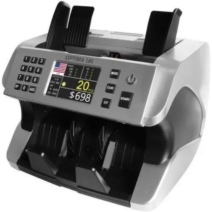 ЛІЧИЛЬНИК БАНКНОТ OPTIMA 185 призначений для роботи у великих касових зонах супермаркетів, розважальних центрах, казино, АЗС, магазинах. Лічильник банкнот швидко і точно перерахує величезну кількість грошових банкнот. Його механізм розрахований на тривалу безупинну роботу. Конструктивно всередині механізму встановлені напрямні повітряних потоків для самоочищення механізму від пилу та паперової стружки. Такий механізм працює тривалий час без зупинки, без технічних збоїв, без обслуговування. Швидкість підрахунку купюр регулюється, є три варіанти швидкості: 900, 1200, 1500 банк./хв. Лічильник банкнот Optima 185 забезпечує можливість калькуляції банкнот по кожному номіналу різних валют у вигляді таблиці та підсумовування результатів підрахунку. Функція нагромадження результатів підрахунку, загальна сума підрахунків. Лічильник виконує функцію фасування купюр у довільній установці фасувальних банкнот від 1 до 999. Має функцію ручного або авто старту для перерахунку валют. Контролює здвоєні купюри та розмір купюр. Перевірка справжності купюри за наступними детекціями: UV (ультрафіолетова), MG (магнітна), DD (розмір банкнот), IR (щільність паперу).