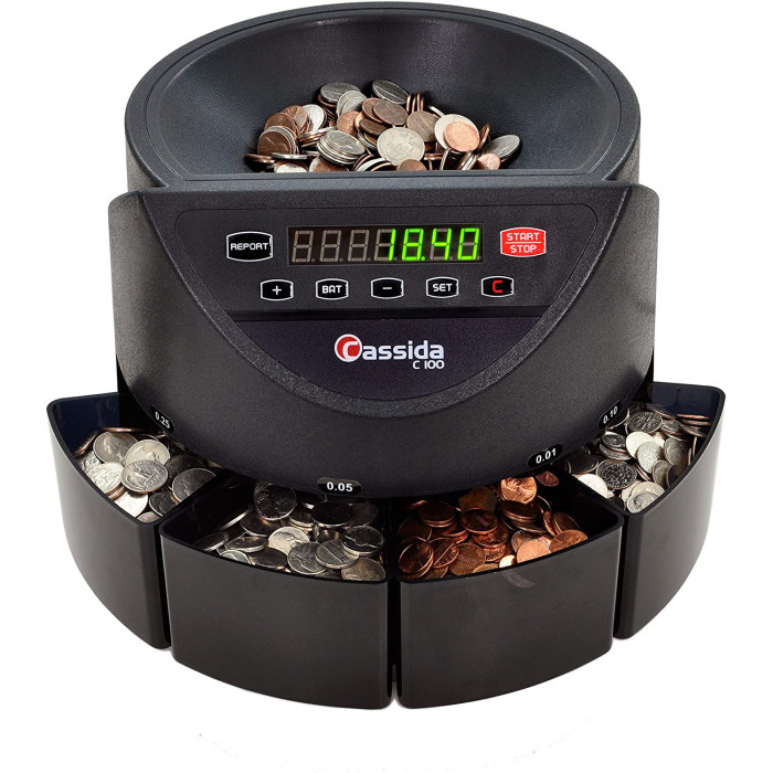 Лічильник монет Cassida C100 - огляд та описCassida C100 є багатофункціональною машинкою для підрахунку і сортування монет, металевих грошей. Набір її можливостей говорить про те, що це професійний апарат, який дозволить...
