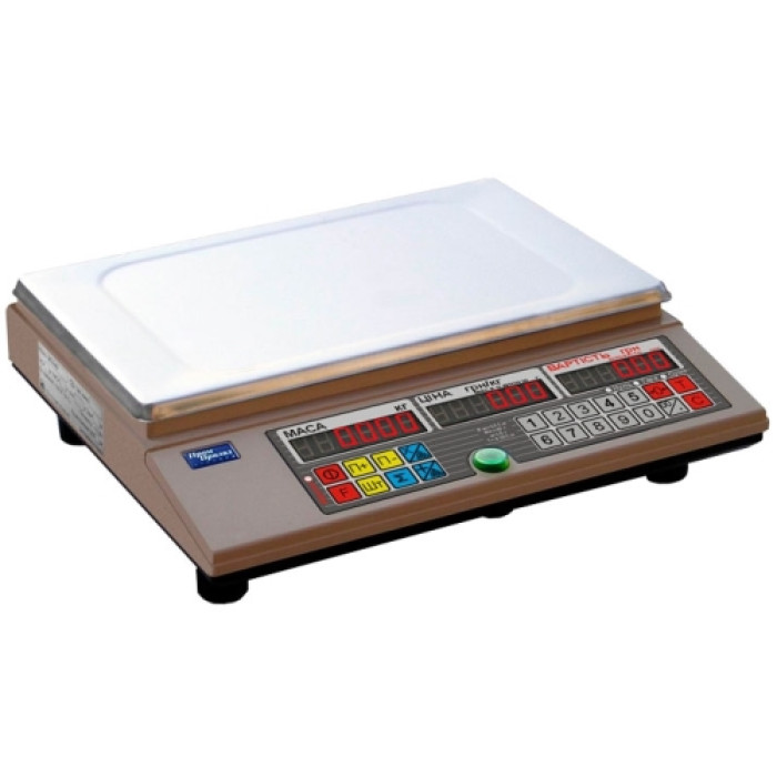 Індикація: Світлодіодний індикатор (3x6 символів, індикація "Маса-Ціна-Вартість"), основний індикатор на корпусі, колір символів червоний