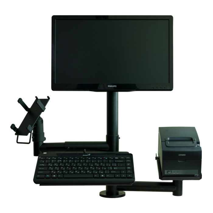 Стійка тримач обладнання - ергономічна конструкція, яка збирається в індивідуальному порядку, виходячи з необхідності встановлення конкретних пристроїв. Рекомендована для організації правильного розміщення електронного обладнання на касовому місці або у місцях самообслуговування супермаркетів. Стійка може містити різний набір кріплень та утримувачів, під необхідні пристрої: принтер чеків, клавіатуру, монітор, фіскальний реєстратор, банківський термінал тощо.