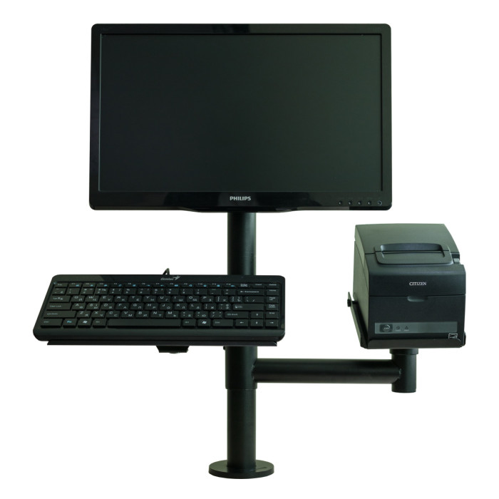 Стійка тримач обладнання - ергономічна конструкція, яка збирається в індивідуальному порядку, виходячи з необхідності встановлення конкретних пристроїв. Рекомендована для організації правильного розміщення електронного обладнання на касовому місці або у місцях самообслуговування супермаркетів. Стійка може містити різний набір кріплень та утримувачів, під необхідні пристрої: принтер чеків, клавіатуру, монітор, фіскальний реєстратор, банківський термінал тощо.