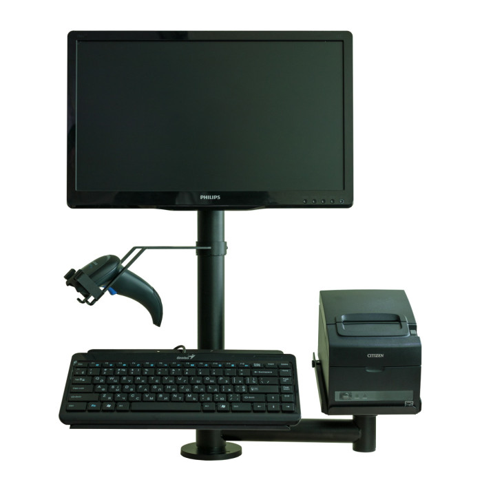 Стійка тримач обладнання - ергономічна конструкція, яка збирається в індивідуальному порядку, виходячи з необхідності встановлення конкретних пристроїв. Рекомендована для організації правильного розміщення електронного обладнання на касовому місці або у місцях самообслуговування супермаркетів. Стійка може містити різний набір кріплень та утримувачів, під необхідні пристрої: принтер чеків, клавіатуру, монітор, фіскальний реєстратор, банківський термінал тощо.