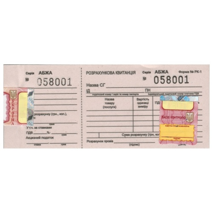 - напис "Розрахункова квитанція", серію (чотири літери) та номер (шість цифр), нанесені під час виготовлення бланка квитанції;