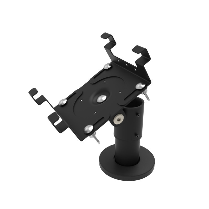 Утримувач для планшета виконаний у металі, кріпиться на металеву опору. Висота опори 85мм. Але можна встановити і на більш високу стійку опору 500мм, 800мм або за Вашим бажанням. Опора всередині порожниста, через неї можна пропускати дроти. Верхня частина закрита декоративною кришкою. Кут нахилу планшета до 180 градусів. Фіксується у зручному для Вас положенні. Регульований механізм кріплення дозволяє фіксувати планшет висотою від 155 мм до 210 мм. Порошкова фарба Колір чорний. Кріпиться до стільниці на саморізах, зверху прикривається декоративною кришкою.