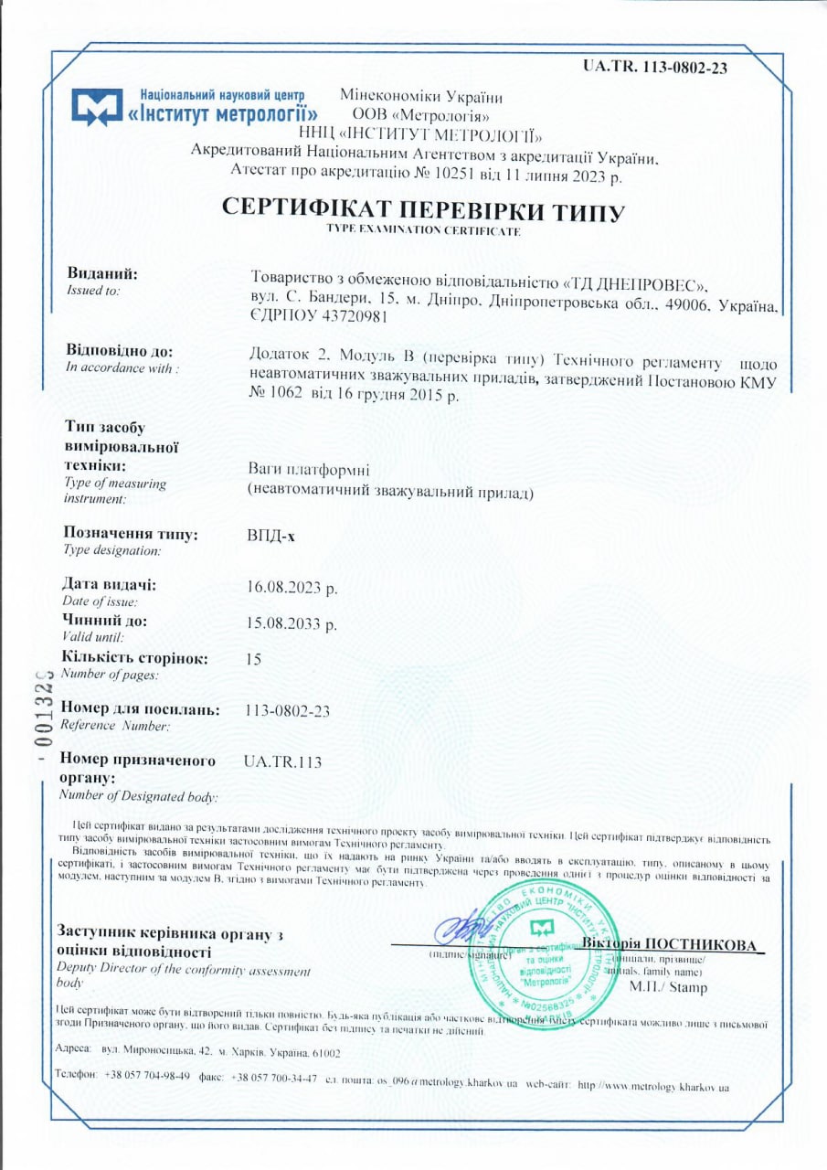 | Сертифікація та відповідність | Ваги сертифіковані в Україні, відповідають вимогам Технічного регламенту щодо неавтоматичних зважувальних приладів. Сертифікат перевірки типу № UA.TR.113-0802-23. |