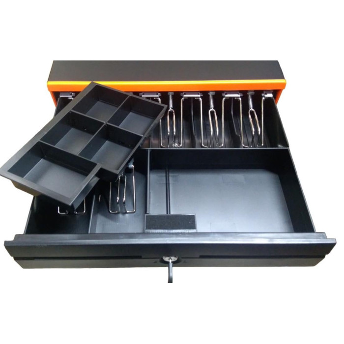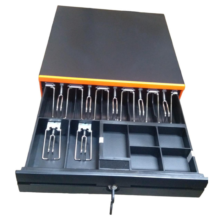Грошова скринька JEPOD A-4043 – класична грошова скринька повнорозмірного форм фактора з лотком, що горизонтально висувається. Корпус та висувний механізм виготовлені з металу, притискні лапки металеві з металевими пружинами. Під купюри відведено 7 відсіків без можливості змінювати ширину кожного з них. Під монети розраховано 5 секцій фіксованих розмірів. Є таємна кишеня для великих купюр, чеків, накладних на товар. Ящик JEPOD A-4043, як правило, встановлюють у стаціонарному режимі у торгових об'єктах із підвищеним потоком покупців. Як і належить пристрою даного класу, замок працює у трьох положеннях, на закриття, відкриття ключем та автоматичне відкриття. Автоматичний режим відкриття передбачає підключення грошової скриньки JEPOD A-4043 до фіскального реєстратора або чекового принтера з подачею живлення на 12В або 24В. Габаритні розміри (ШхДхВ) 405 мм х 420 мм х 105 мм, з урахуванням висоти ніжки. Корпус виготовлений у чорному кольорі.